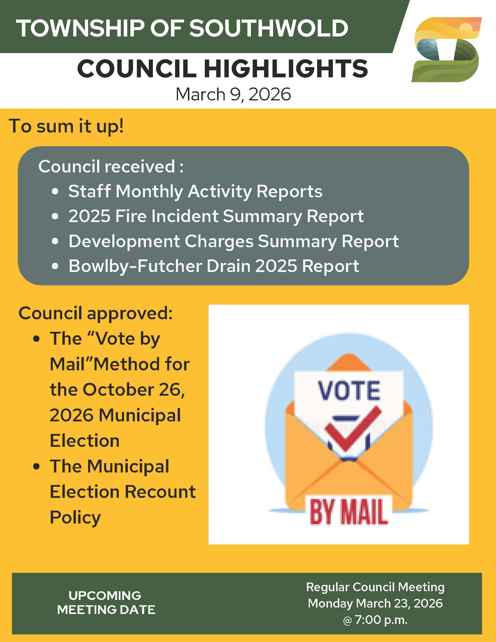 We understand this will be a challenging year with the construction in Shedden and Fingal. The Township is not cancelling any community events and is...