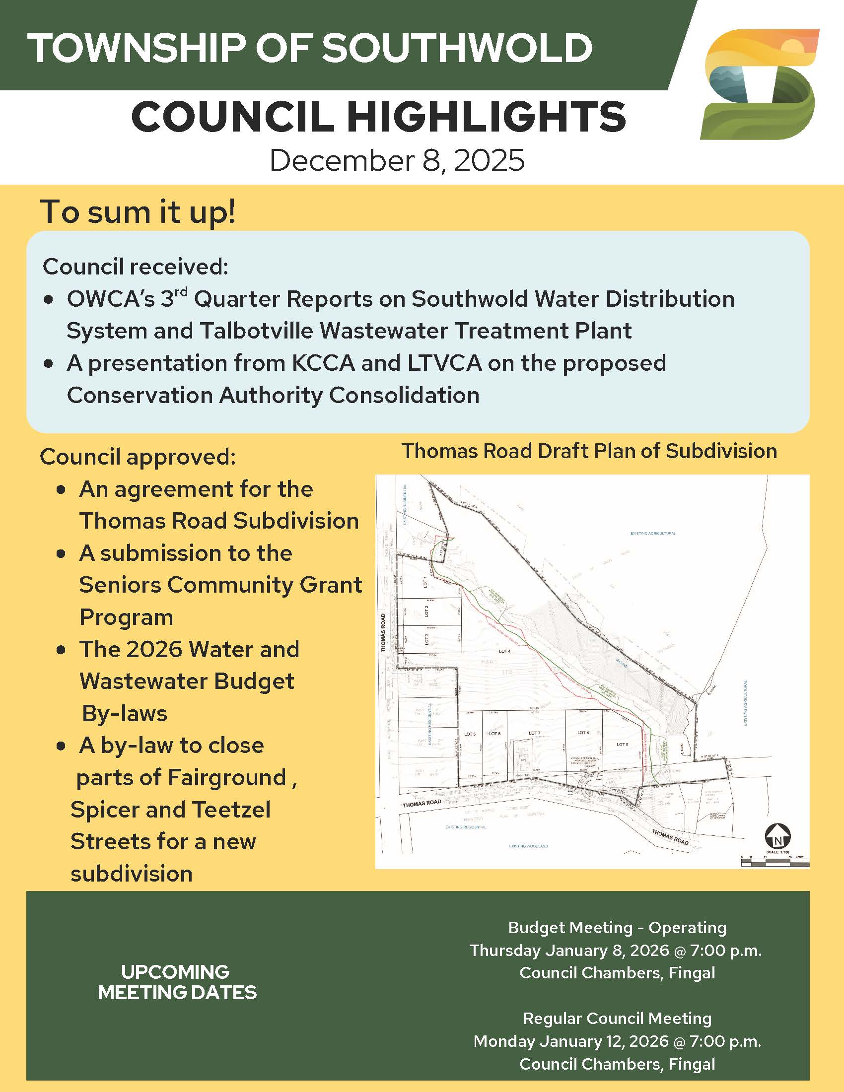 The Township Office will be closed on December 24th, 2025 at 12 pm (noon), for the holidays. The Office will reopen January 5th, 2026 at 8 am.