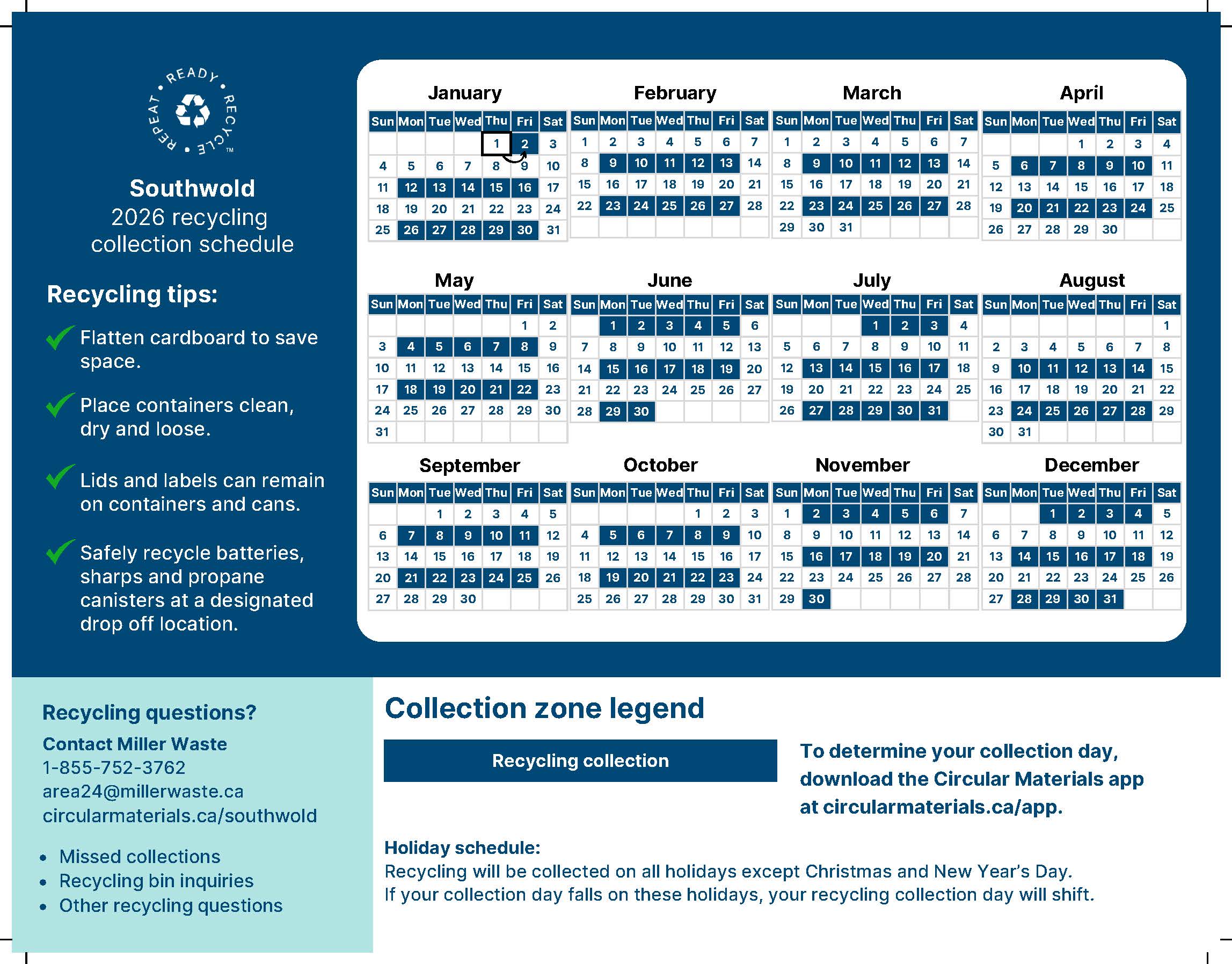 Southwold’s blue box recycling program is now managed by Circular Materials – the administrator of the common collection system and a not-for-profit organization that is committed to building an efficient and effective recycling system in Ontario. Click here to visit Circular Materials’ website.