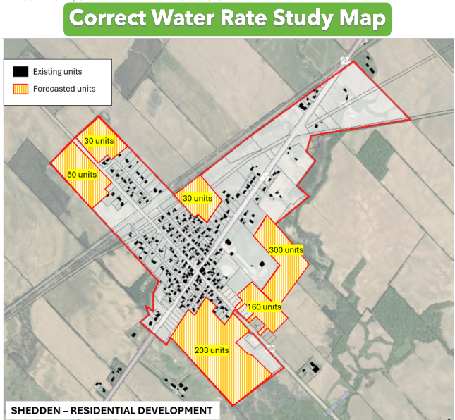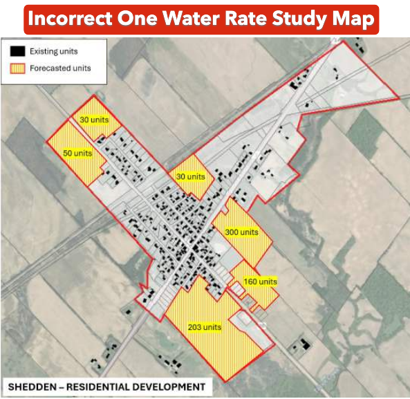 During the review period of the final One Water Rate Study report, an error was identified in the mapping for the Shedden Development Area (see Image 2). This issue was flagged to the consultant, and the map was corrected and the updated report posted to the Township website.